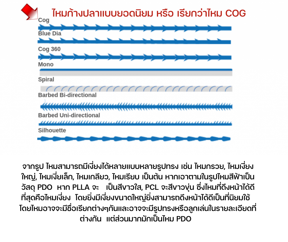 ซึ่งส่วนมากจะเป็นไหมชนิดที่ทำจาก PDO แต่ทำออกมาในลักษณะรูปร่าง ต่างๆ มีจุดเด่นต่างๆกัน ซึ่ง ที่ได้ยินบ่อยที่สุดคือไหมเงี่ยง (บางทีก็เรียกก้างปลา) หรือไหมCOGเพื่อยกกระชับ ใบหน้า รองลงมาคือไหมเรียบหรือไหมMONOเพื่อกระตุ้นการสร้างคอลลาเจน อื่นๆที่ตั้งชื่อมาเพื่อการตลาดซึ่งมักจะเป็นไหมเงี่ยงเช่น ไหมเงี่ยงกุหลาบ ไหมปากปลาฉลาม ไหมดับเบิ้ลล็อก ไหม 8D ไหมทอร์นาโด ไหมมังกร เป็นต้น
