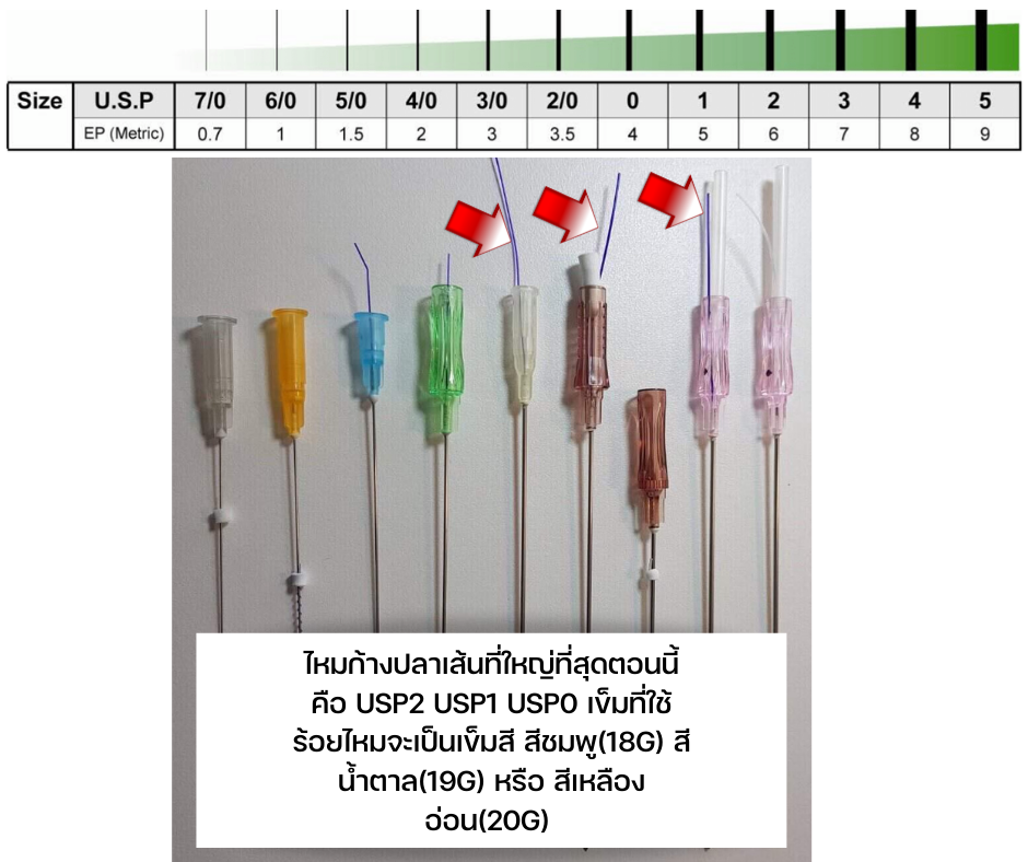 VII. เข็มที่มีสีชมพู 18G : ใช้สำหรับการร้อยไหมที่มีขนาด USP2 (ซึ่งในปัจจุบันนี้ ถือเป็นไหมก้างปลาที่มี ขนาดใหญ่ที่สุด)